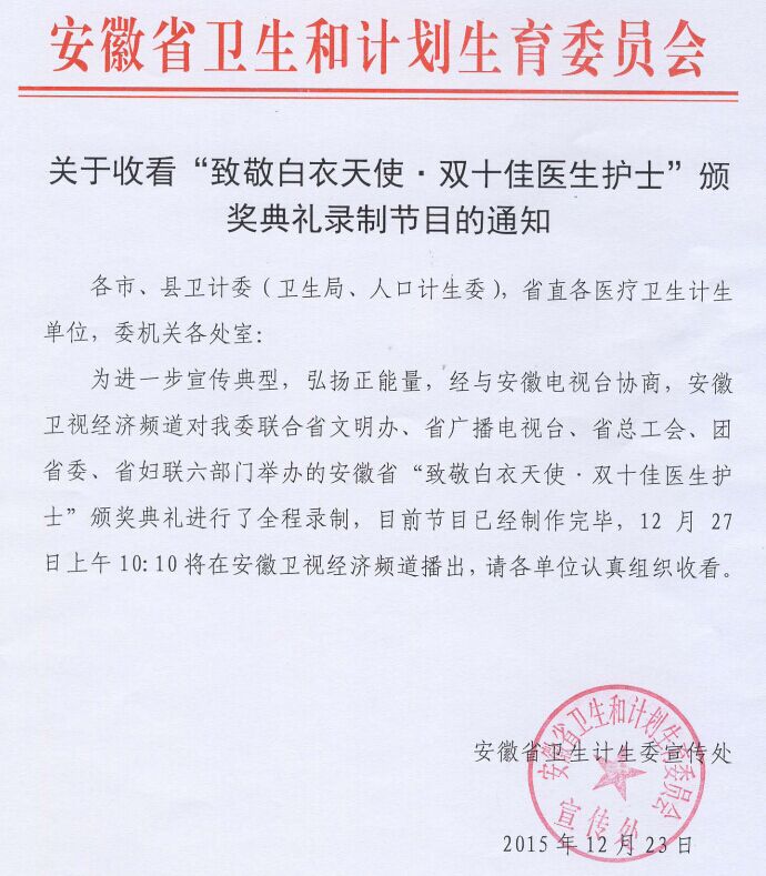 关于收看“致敬白衣天使 双十佳医生护士”颁奖典礼录制节目的通知