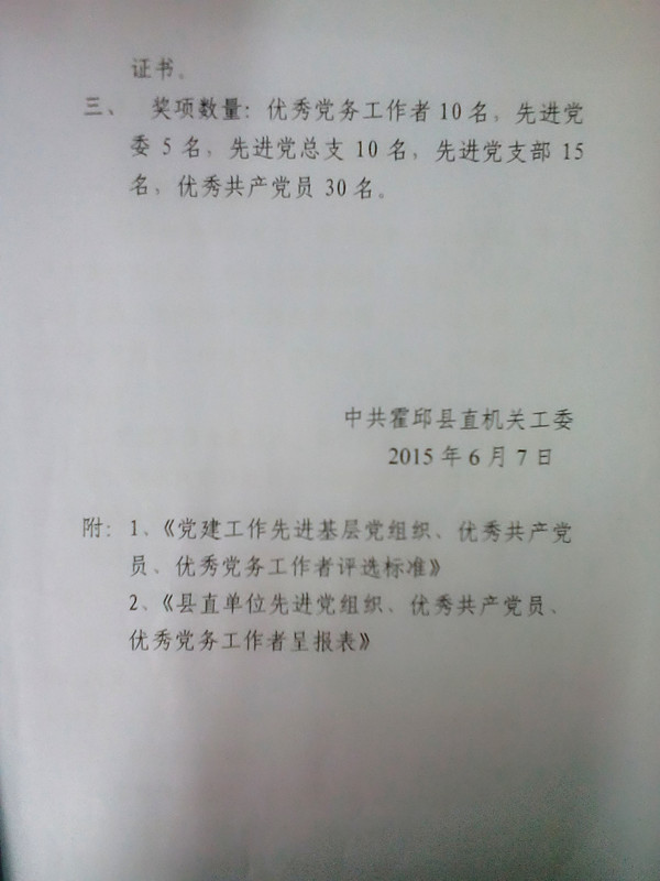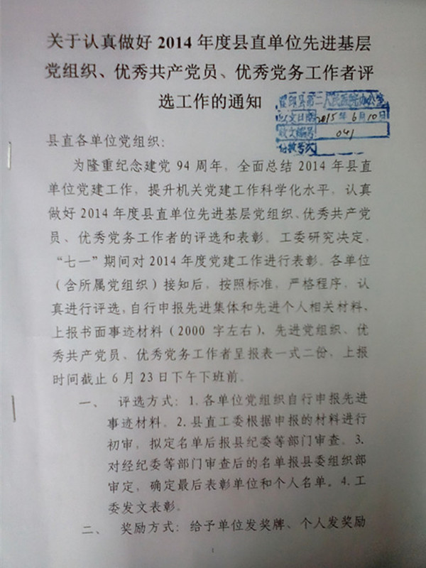 现将中共霍邱县直机关工委《关于认真做好2014年度县直单位先进基层党组织、优秀共产党员、优秀党务工作者评选工作的通知》印发给你们,请按照要求,实事求是,组织做好评选工作和自荐工作,并及时提交相关材料报送院党总支。