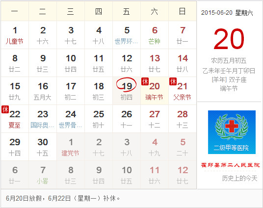 2015年端午节放假安排为:6月20日(周六、端午节)放假,与6月21日(星期日)、6月22日(星期一)连休。