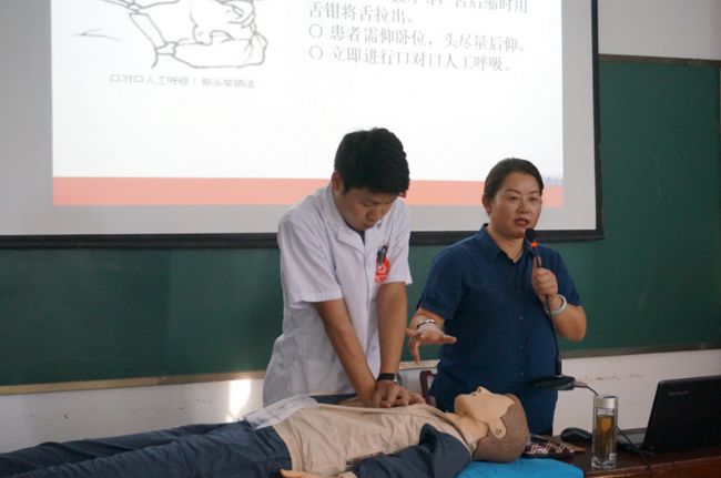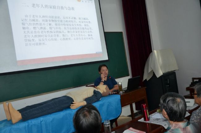 活动中,霍邱县二院院党委委员、护理部主任、红十字会志愿者及培训讲师葛珺就老年人的家庭自救与急救、老年人常见病症的自救与急救、老年人突发意外的自救与急救以及老年人疾病家庭急救和自救中需要注意的问题等,通过PPT课件和现场模拟人的演示,深入浅出地为老年朋友们进行了阐述。