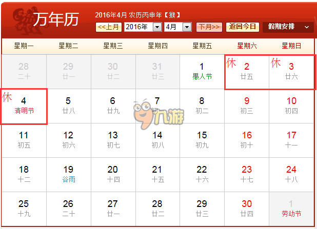 2016年清明节放假安排为:4月4日(周一)放假,与周末连休。