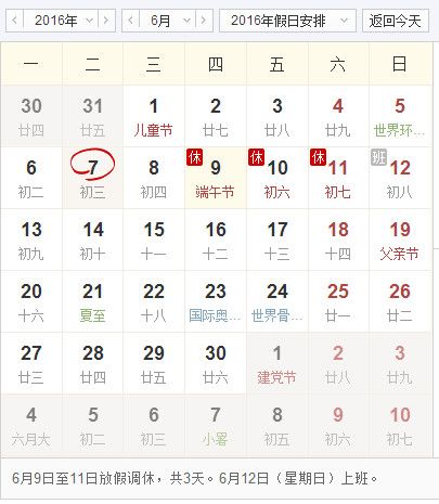 2016年端午节放假安排为:6月9日(周四)、6月10日(周五)、6月11日(周六正常休息),共计3天。6月12日(周日不休)上班其中6月9日(星期四,农历端午节当日)为国家法定节假日,6月10日(星期五)调休,6月12日(星期日)正常上班。