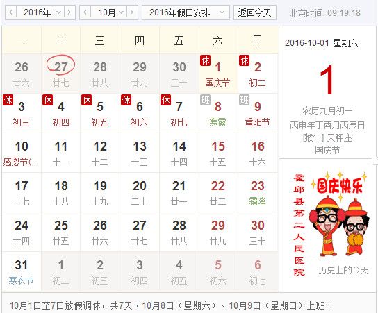 2016年国庆节放假安排为:10月1日至10月7日,共7天。10月8号(星期六),10月9号(星期天)正常上班。。