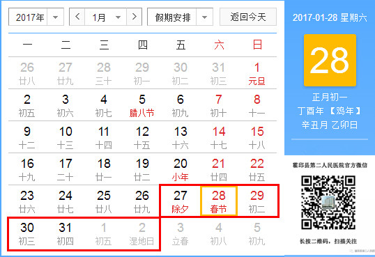 霍邱县二院网(发布/信息科  根据《国务院办公厅关于2017年部分节假日安排的通知》精神,现将2017年春节放假日期安排通知如下: