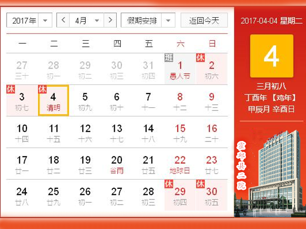 霍邱县二院网 (编制/信息科) 2017年清明节放假安排为:4月2日至4日放假调休,共3天。4月1日(星期六)上班。 节假日期间,请各临床、医技等科室做好排班值班工作。其他科股室、总值班处认真做好值守应急和安全保卫等工作。