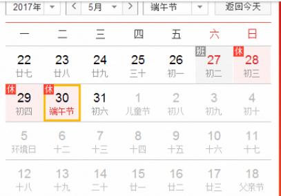 霍邱县二院网     2017年端午节放假安排为:5月28日至30日放假调休,共3天。5月27日(星期六)上班。