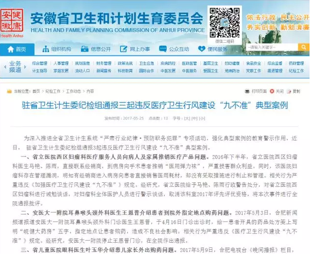 近日,驻安徽省卫生计生委纪检组通报了3起违反医疗卫生行风建设“九不准”典型案例,涉及三家医院四名医生,分别为: