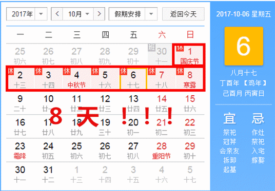 霍邱县二院网 2017年国庆节放假安排为:10月1日至8日放假调休,共8天。9月30日(星期六)上班。