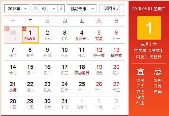 霍邱县二院网    根据国务院办公厅关于2018年部分节假日安排的通知规定,5月1日(星期二)劳动节放假,与周日连休(4月29日-5月1日),4月28日(星期六)上班,共3天。