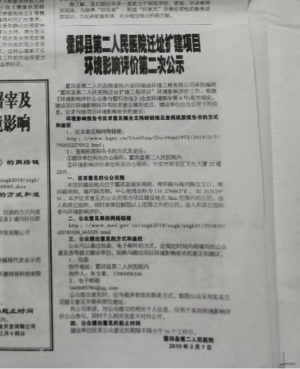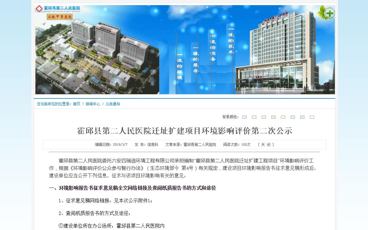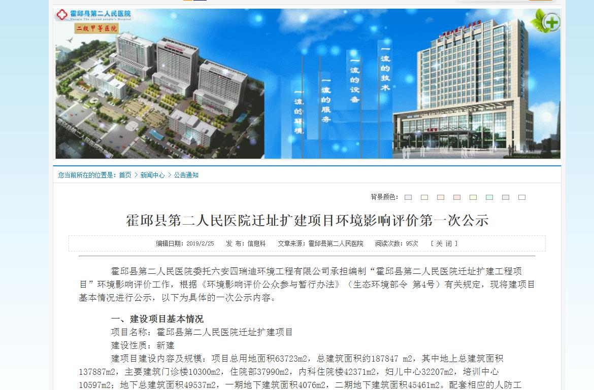 受霍邱县第二人民医院委托,六安四瑞迪环境工程有限公司承担《霍邱县第二人民医院迁址扩建工程项目环境影响报告书》的编制工作;2019年2月25日,该项目在霍邱县第二人民医院网站进行了首次环境影响评价信息公示;2019年3月7日,该项目在霍邱县第二人民医院网站进行了征求意见稿公示。