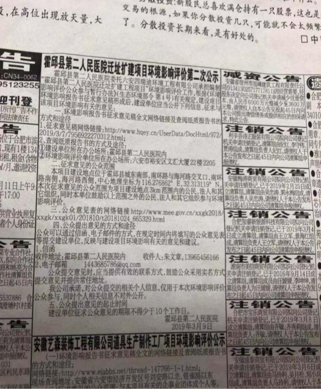 公开载体及可行性分析:本项目首次环境影响评价信息公示平台位于六安市霍邱县第二人民医院网站,符合《环境影响评价公众参与办法》(生态环境部令 第4号)第九条:“建设单位应当在确定环境影响报告书编制单位后7个工作日内,通过其网站、建设项目所在地公共媒体网站或者建设项目所在地相关政府网站公开信息”的要求。故本项目公开载体可行。