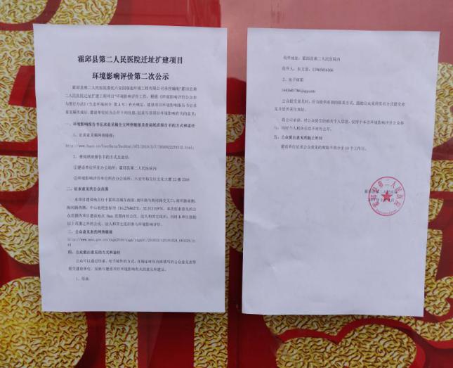 我单位已按照《办法》要求,在霍邱县第二人民医院迁址扩建工程项目环境影响报告书编制阶段开展了公众参与公众,在环境影响报告书中充分采纳了公众提出的与环境影响相关的合理意见,对未采纳的意见按要求进行了说明,并按照要求编制了公众参与说明。