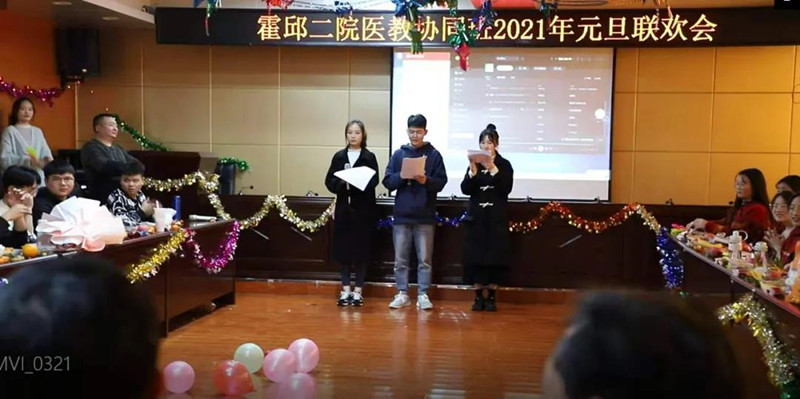 霍邱县二院网 笑语欢声,吹响新年号角,载歌载舞,不忘医学使命。为丰富医教协同班学子们的课余文化生活,营造良好的尊师重教氛围,12月31日,霍邱县二院医教协同班2021年元旦联欢会在县残联四楼多功能厅举行。霍邱县残联理事长姚建东、副理事长朱立军,霍邱县二院党委书记宋银修、院长冯宣付、副院长朱勇、吴莉、鲍广兵及各临床科室带教老师与医教协同班学生欢聚一堂,庆元旦、迎新年。