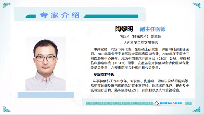 六安市医学会肿瘤内科分会委员中共党员,六安市党代表,安徽医科大学肿瘤学在职研究生,肿瘤学科带头人,肿瘤内科副主任医师。2010年毕业于安徽医科大学临床医学专业,2018年在安医大二附院肿瘤中心进修。