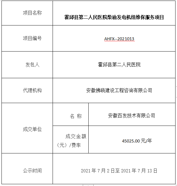 霍邱县第二人民医院柴油发电机组维保服务项目成交结果公示