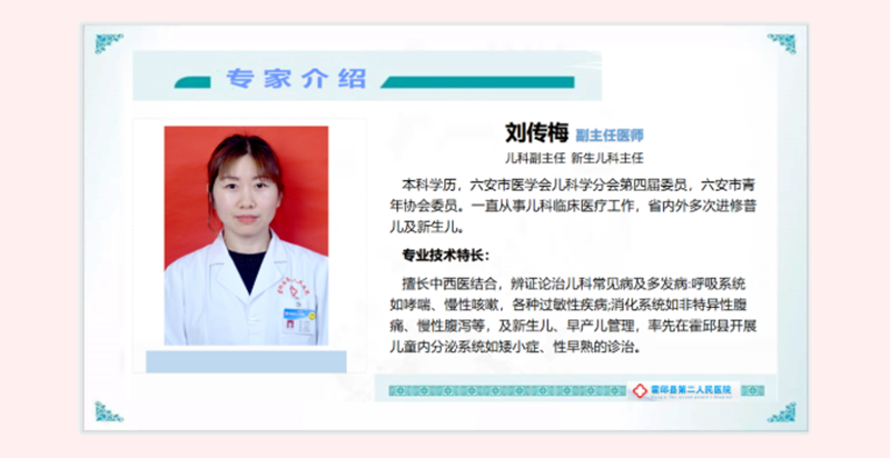 霍邱二院网 为响应国家“健康中国行动”,关爱儿童,助力成长,霍邱县第二人民医院儿科将于2022年7月17日邀请安徽省儿童医院陈雨青主任来院开展生长发育义诊活动。