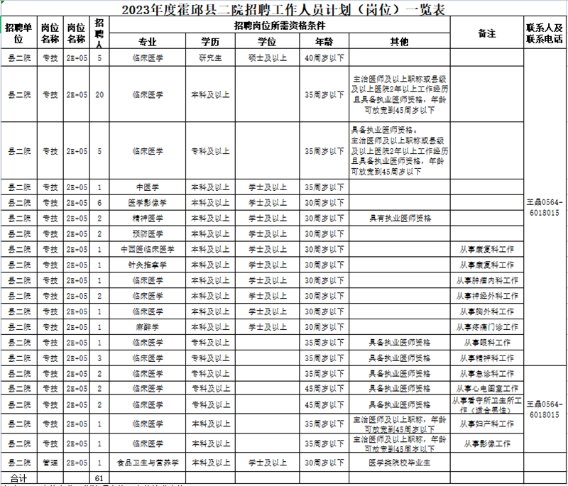 招聘数197名,其中县一院116名、县二院61名、县中医院20名。具体详见《2023年度霍邱县一院、县二院、县中医院招聘工作人员计划(岗位)情况一览表》(以下简称《一览表》。