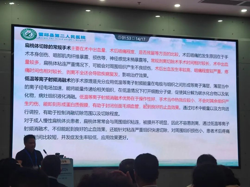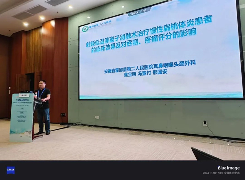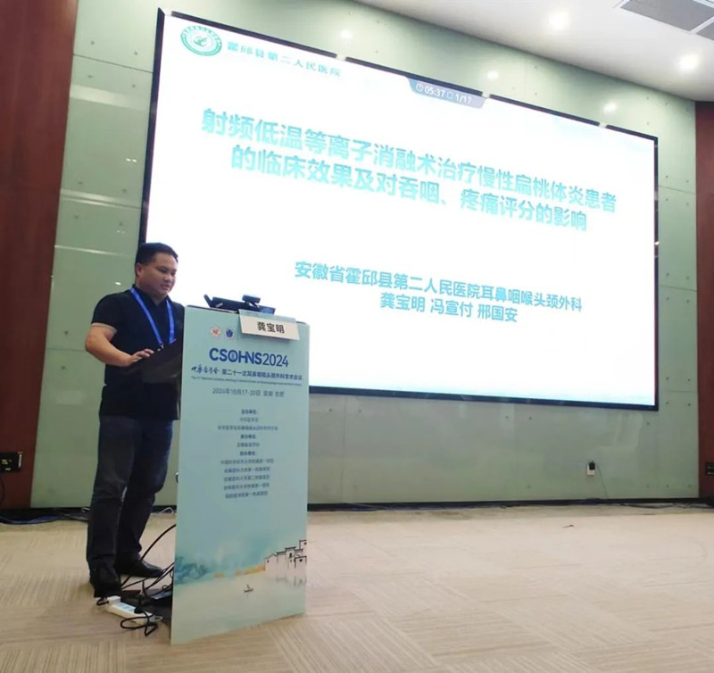 在咽喉学组,扁桃体腺样体-1分会场,龚宝明就推送的作品《低温等离子射频消融术治疗慢性扁桃体炎患者的临床效果及对吞咽、疼痛评分的影响》课题在大会作论文发言交流,进行了分享,通过详细临床资料和数据分析对比得出:在慢性扁桃体炎患者的治疗中实施射频低温等离子消融术,在手术时间、患者的吞咽功能、疼痛症状以及术后并发症发生率上,优于常规扁桃体剥离术。内容非常精彩,并在多篇稿件中脱颖而出,是全国仅2家受邀在大会发言的县级医院中,唯一一家二级医院获此殊荣的单位。