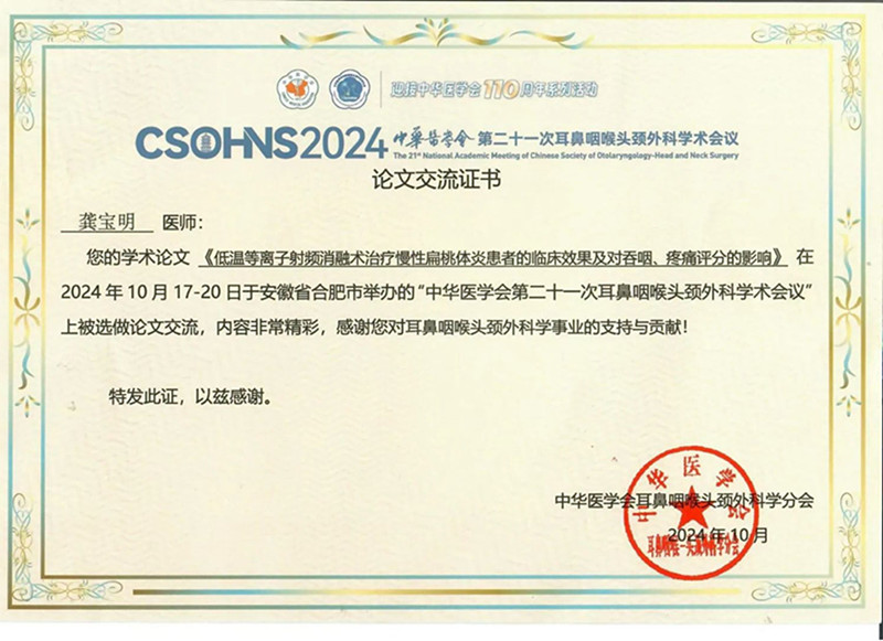 此次大会,我院耳鼻喉科共推送3篇论文:《低温等离子射频消融术治疗慢性扁桃体炎患者的临床效果及对吞咽、疼痛评分的影响》《低温等离子在耳鼻喉科临床手术中的应用价值》《变应性鼻炎的外科治疗体会》,均被大会评审为“大会发言”及“书面交流”。
