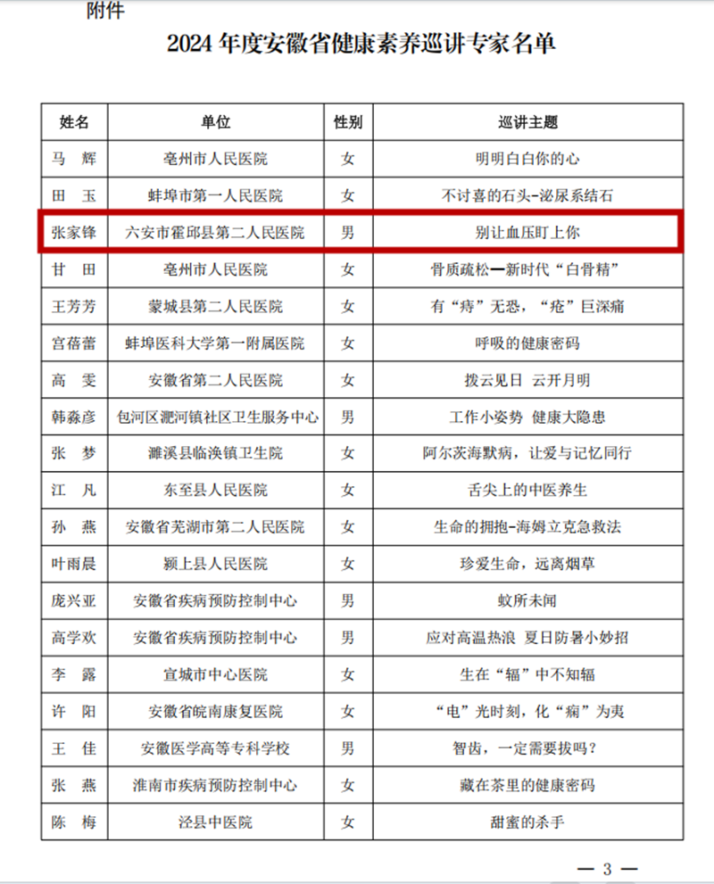 近日,省卫健委公布2024年安徽省健康素养巡讲专家名单,县二院内一科张家锋医师成功入选省级专家库,荣获“安徽省健康素养巡讲专家”称号,成为本年度我县唯一入选的巡讲专家。