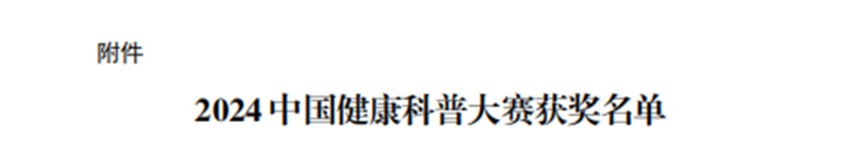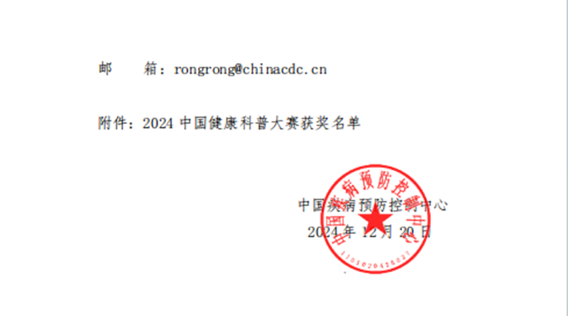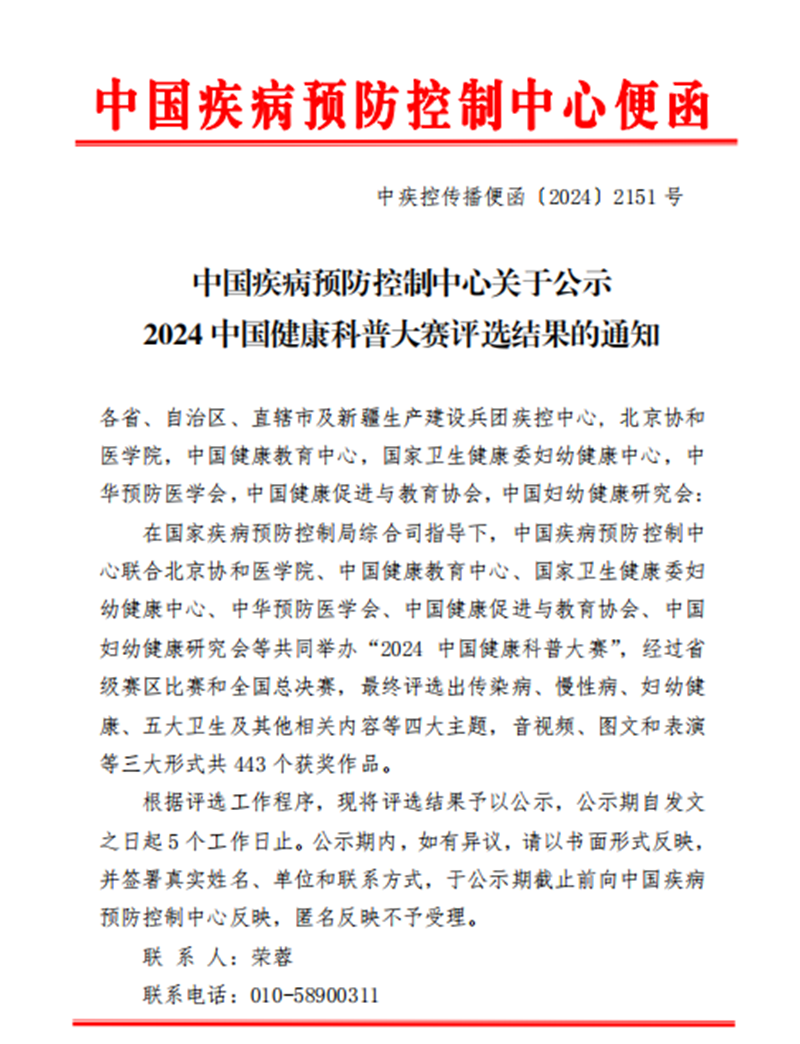 近日,在国家疾病预防控制局综合司指导下,中国疾病预防控制中心联合北京协和医学院、中国健康教育中心、国家卫生健康委妇幼健康中心、中华预防医学会、中国健康促进与教育协会、中国妇幼健康研究会等共同举办“2024 中国健康科普大赛”,经过省级赛区比赛和全国总决赛,最终评选出传染病、慢性病、妇幼健康、五大卫生及其他相关内容等四大主题,音视频、图文和表演等三大形式共443个获奖作品。