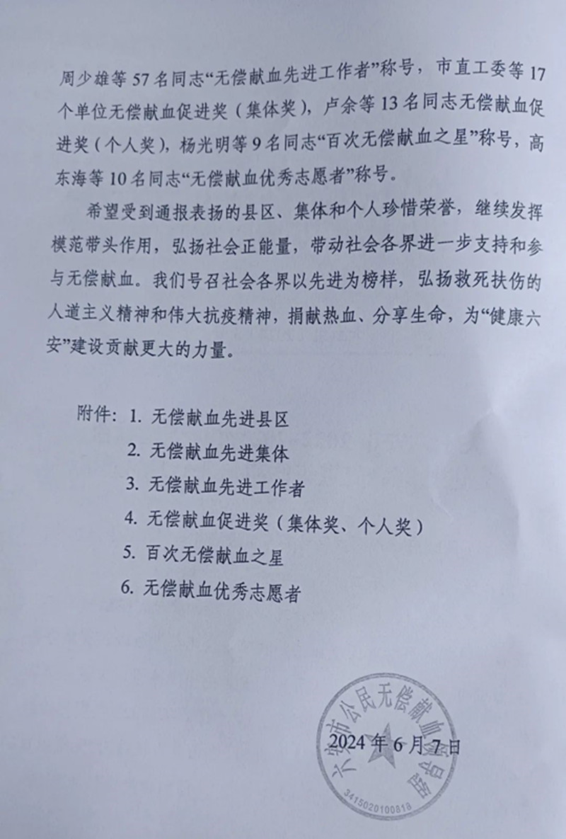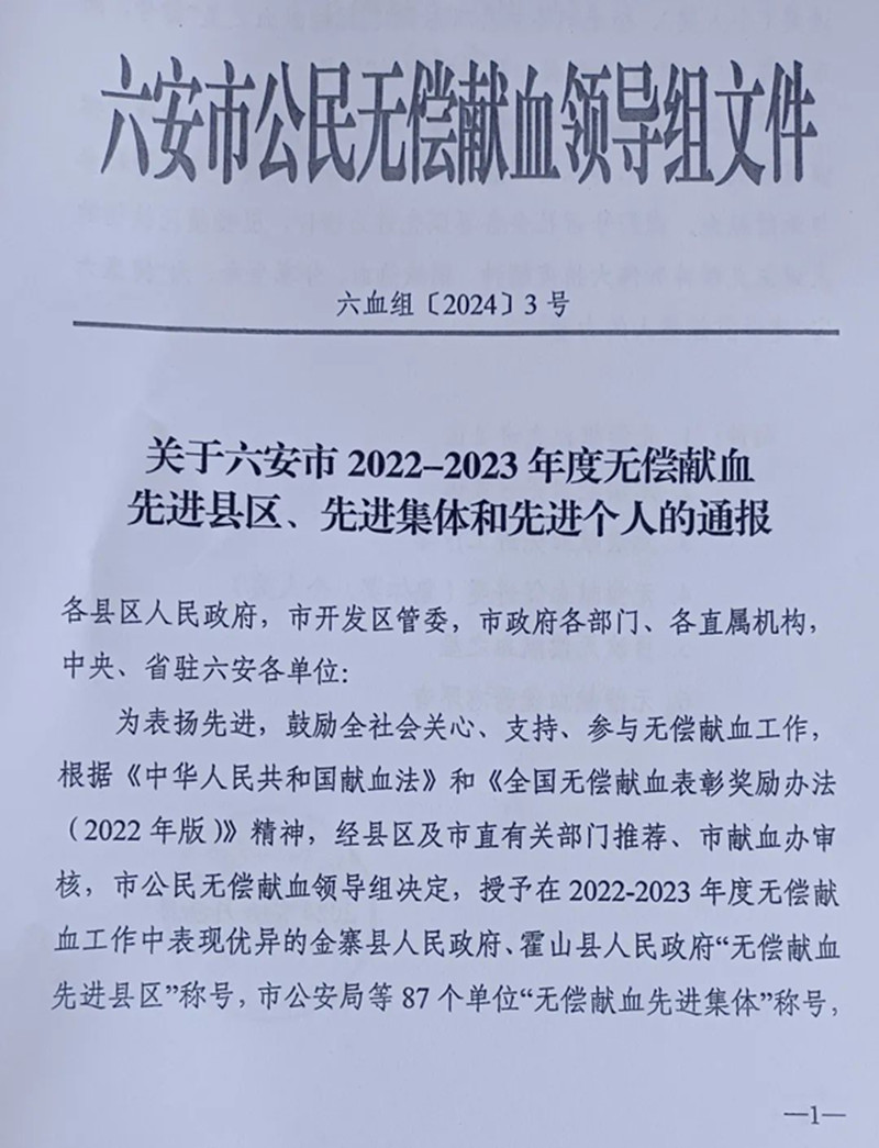 霍邱二院网 近日,六安市公民无偿献血领导组印发《关于六安市2022-2023年度无偿献血先进县区、先进集体和先进个人的通报》(六血组〔2024〕3号),对全市一批无偿献血先进单位、先进集体和先进个人进行了通报表扬,其中县二院被授予“无偿献血先进集体”荣誉称号。