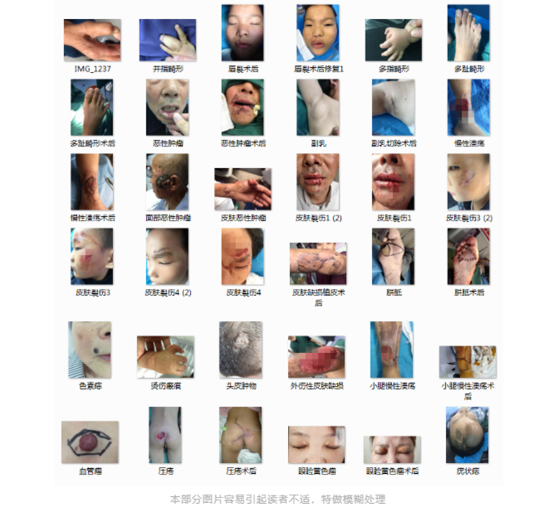 02. 整形手术类:面部外伤皮肤美容缝合(可达到无瘢痕或减少瘢痕),皮肤肿物、肿瘤的切除及修复,皮肤慢性溃疡的皮瓣或植皮治疗,压疮治疗,瘢痕手术修复,先天性多指(趾)、并指矫正,肌性斜颈矫正。