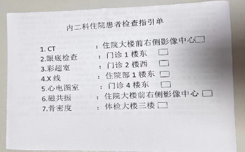 我科患者多为中老年患者,其中许多患者独自看病或者夫妻俩相伴住院。对于刚入院的患者,面对新的环境容易迷路,而且需要做各项检查,为了方便患者,我科专门为患者制作了一张检查指引单,将所需要的检查内容写在卡片上,患者可以明确知道自己所要检查的项目和位置。对于不认识字的老年患者,拿着卡片,可方便询问他人。