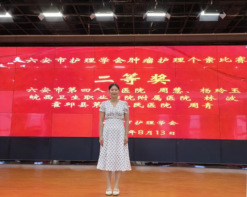 “本次比赛不仅是选手们之间的较量,更是一次难得的学习机会。通过这场比赛,让我们学习了肿瘤的各种精细化护理,创新型护理,中医护理实践。让我对个案护理有了新的认识。肿瘤是当今备受关注的健康问题,它不仅影响了患者的生活质量,更是家庭和社会的重大负担,但是通过个性化的护理和治疗,我们可以与肿瘤相抗争,为健康开启新的篇章!作为肿瘤科的护士,我们更应该以仁爱之心,担当起护理重任。我们的这份工作不仅仅是治疗疾病,更是给予患者了希望和勇气。”内四科病区(消化内科/肿瘤内科/风湿免疫内科)副护士长周青在获奖后说道。