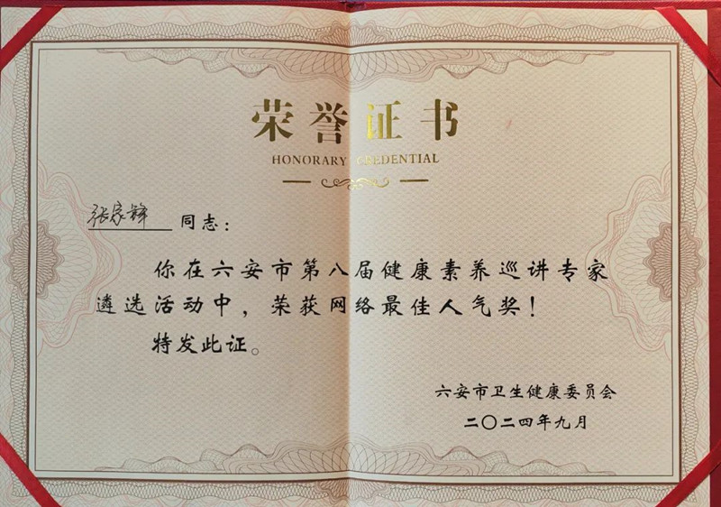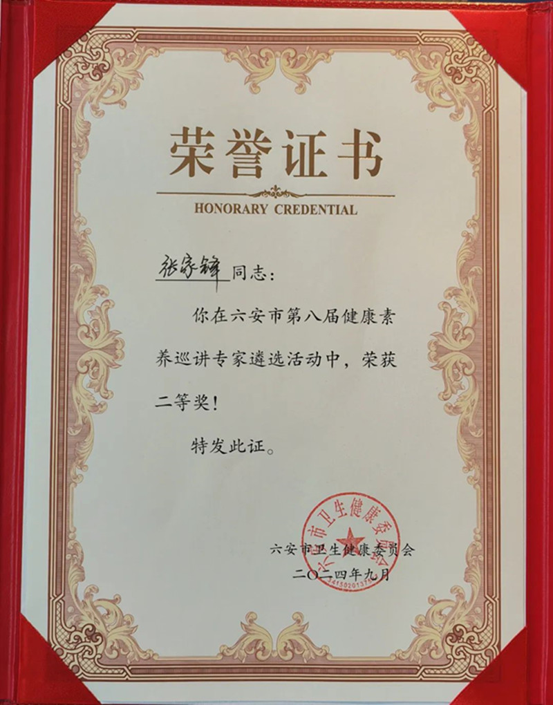 活动中,县二院内一科医生张家锋经现场评选,以优异成绩荣获全市“第二名”,成功入选六安市健康素养巡讲专家库——成为我县2024年度唯一入选的市级健康巡讲专家。同时,张家锋参赛作品经过大众网络投票评选,也成功斩获“网络最佳人气奖”——成为全市唯一获得“双奖项”的参赛选手。