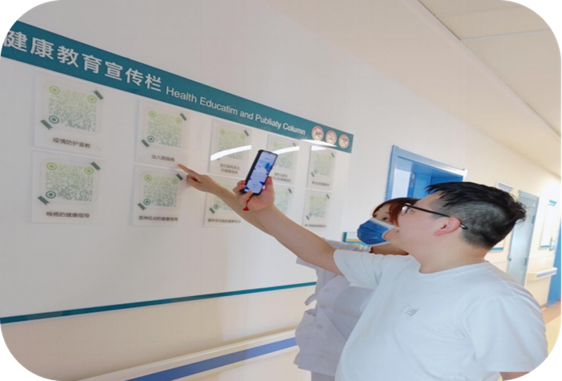 责任护士指导新入院患者扫描科室建立的健康教育宣教二维码,为其宣教入院注意事项。