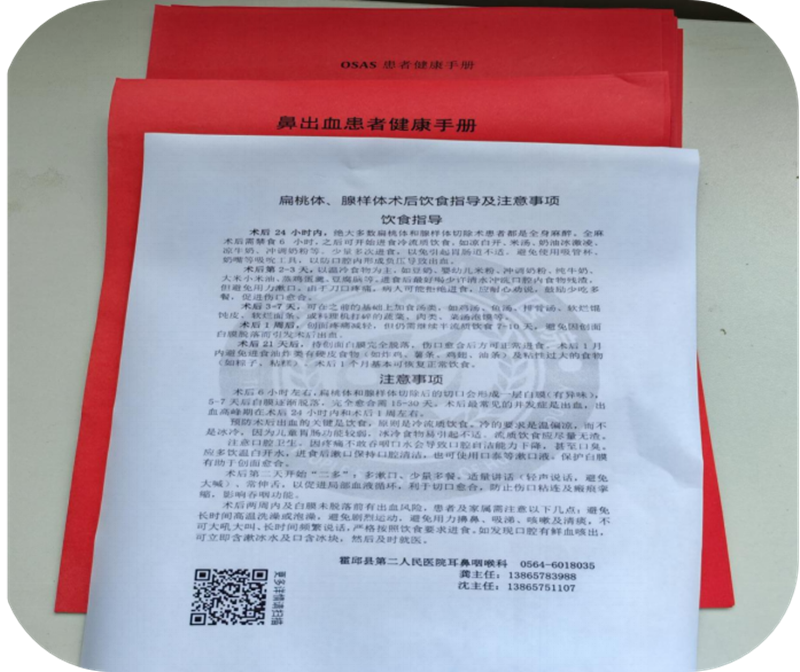 为每位住院患者发放一个便民袋,便于患者住院期间存放各种票据、社保卡、身份证等。便民袋里有我们霍邱县第二人民医院耳鼻喉科的简介、科室的联系电话。