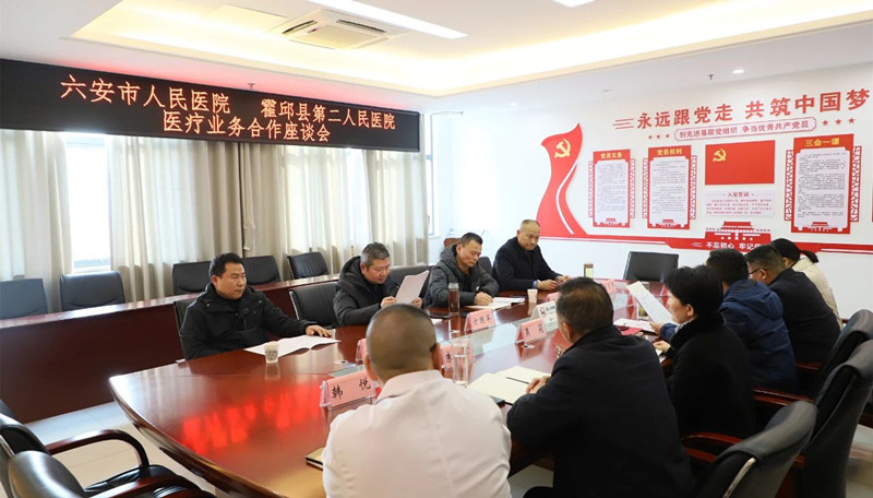 霍邱二院网 2月13日,六安市人民医院、霍邱县二院医疗业务合作座谈会在县二院住院部十六楼党委会议室召开。市人民医院党委委员、副院长方国军,西院区副院长、医疗业务拓展部主任达多田,医务部副主任吴永军,医疗业务拓展部副主任罗来兵莅临现场。县二院党委书记周进携班子成员及相关科室负责人参加座谈会。