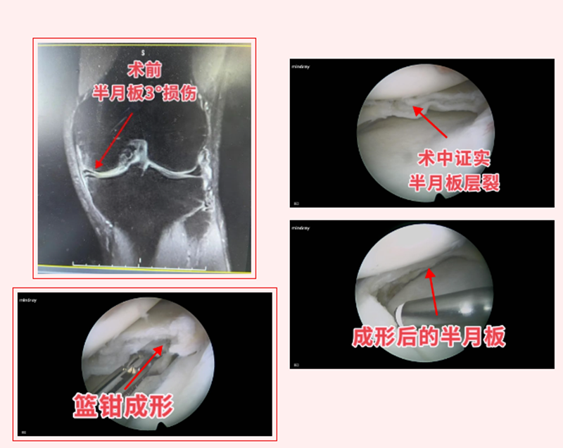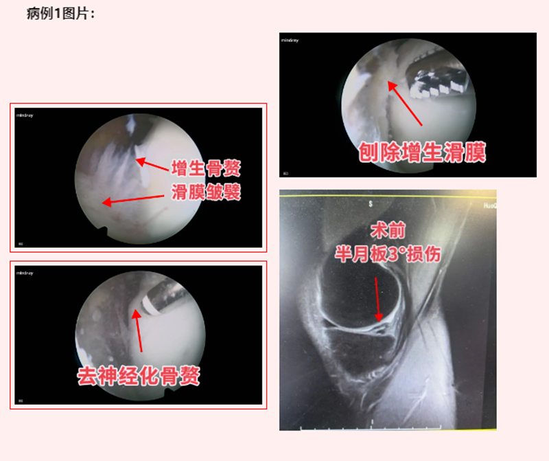 病例1:患者赵XX,43岁男性,因膝关节疼痛半年,来县二院就诊,行膝关节核磁共振检查,发现膝滑膜皱襞增生+半月板Ⅲ°慢性损伤,住院治疗。2025年1月,在住院部三楼层流手术室行关节镜下滑膜皱襞综合征滑膜皱襞切除+半月板Ⅲ°慢性损伤半月板成形术。手术顺利,术后患者恢复良好,治疗满意。