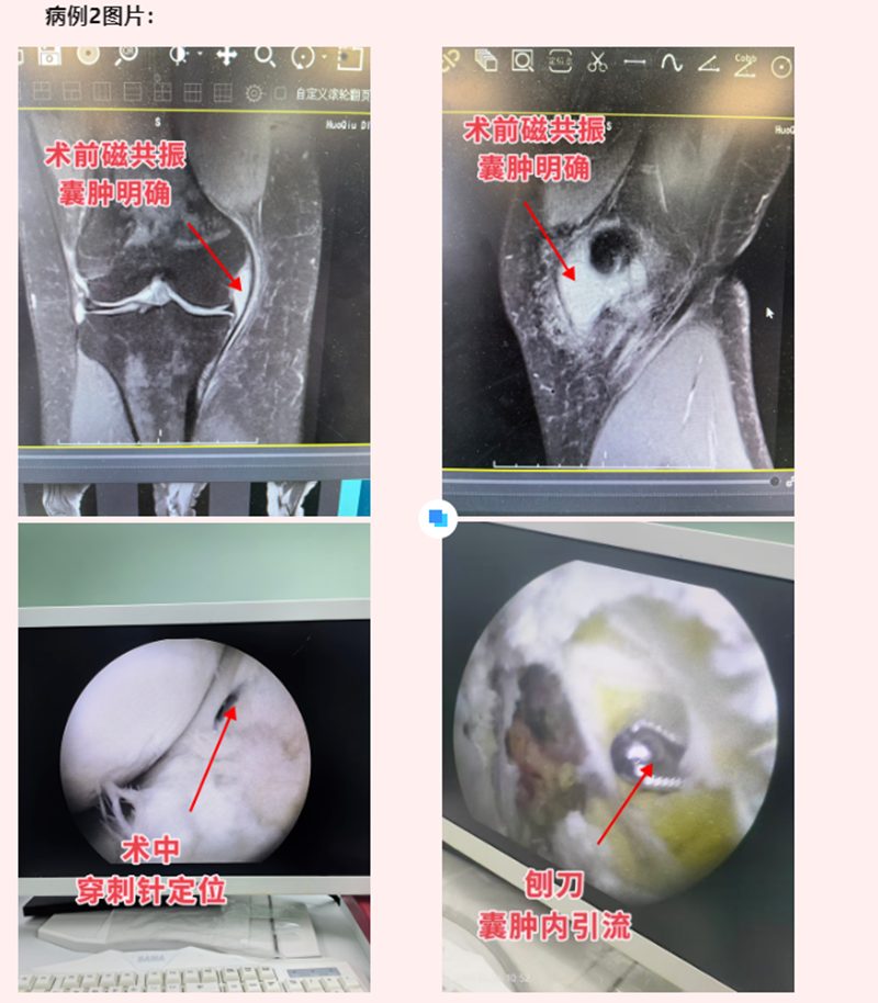 病例2:患者时XX,52岁女性,因膝关节疼痛1月,来县二院就诊,行膝关节核磁共振检查,发现膝内侧副韧带囊肿+半月板Ⅲ°慢性损伤,2025年2月,在住院部三楼层流手术室行关节镜下膝内侧副韧带囊肿内引流术+半月板Ⅲ°慢性损伤半月板成形术。手术顺利,术后患者恢复良好,治疗满意。
