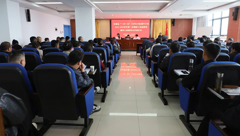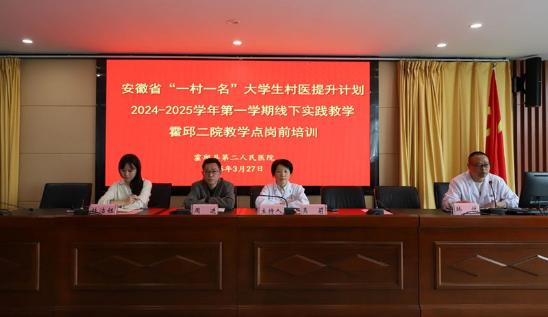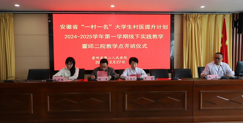 霍邱二院网 3月27日,安徽省“一村一名”大学生村医提升计划暨合肥职业技术学院2024-2025学年第一学期大学生村医线下实践教学点开班仪式(第一批)在县二院住院部十六楼会议室顺利举行。县卫健委基层卫生股、医改股股长桂洁钰,县二院党委书记周进,副院长吴莉,医务科科长、重症医学科主任韩悦出席仪式并讲话。全体实习医生、各带教科室主任及相关科室负责人参加开班仪式。