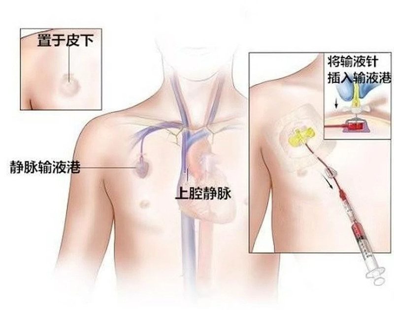 “输液港”是一种完全植入体内的静脉输液装置,由注射座和导管组成。注射座通常埋置在胸壁皮下,导管则连接至大静脉,如锁骨下静脉或颈内静脉,通过这一装置,医护人员可以方便地进行药物注射、输血、营养支持等治疗。