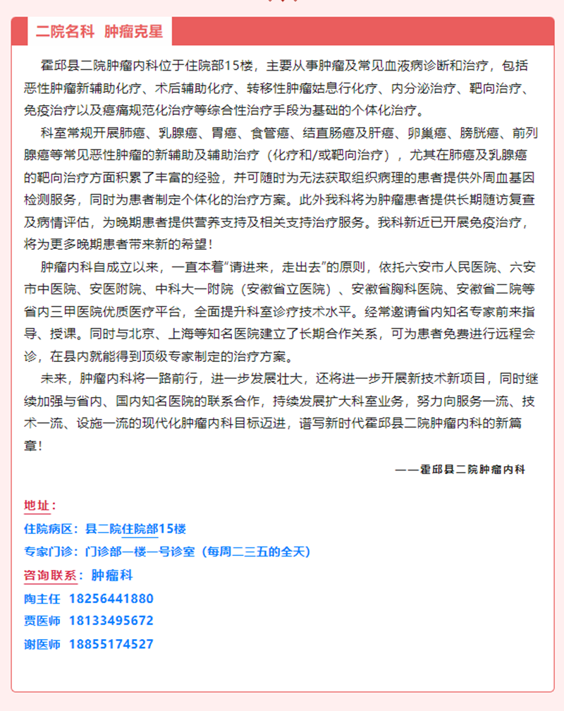 县二院肿瘤科不断深入强化学科建设和发展,持续探索和创新,积极开展新技术新业务,提升综合服务能力,着力于为患者提供更加安全、便捷、高效、优质的医疗服务,为更多患者带来希望和健康。