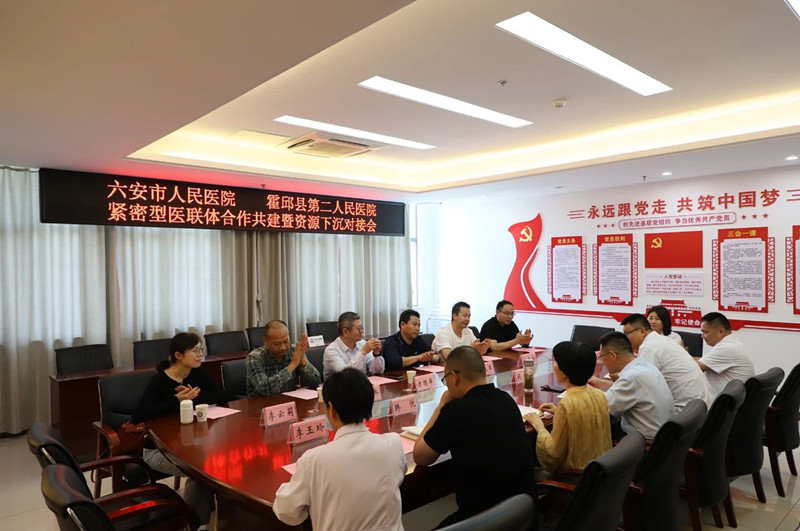 霍邱二院网 5月25日,六安市人民医院与霍邱县二院紧密型医联体合作共建暨医疗资源下沉对接会在霍邱县二院住院部16楼党委会议室圆满举行,标志着两家医院深化合作迈入实质化阶段,市人民医院首批专家团队正式进驻霍邱县二院。市人民医院党委委员、副院长方国军,县二院党委书记周进等院领导及两院相关科室负责人和学科专家参会。