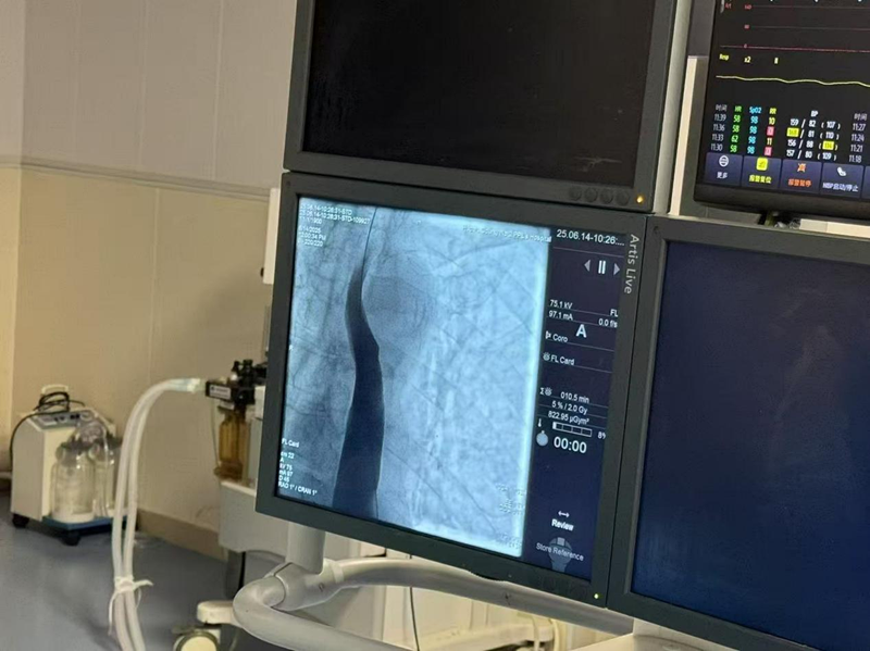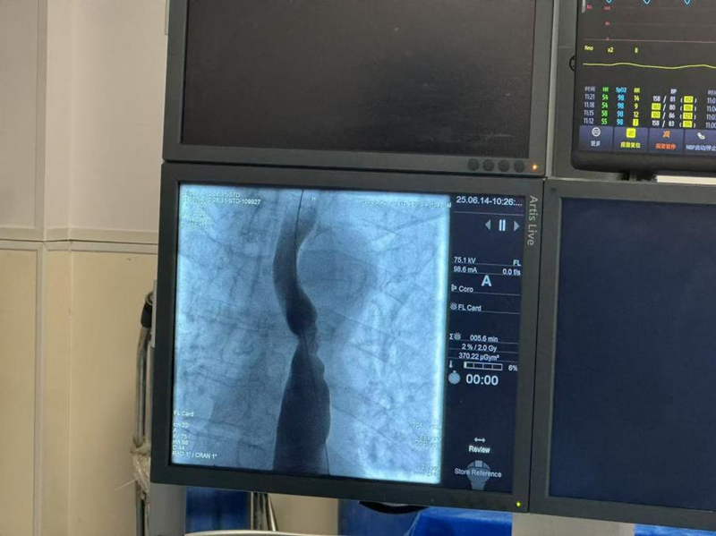 据了解该患者两年前因胃癌接受根治手术,近期出现严重进食哽咽症状,甚至无法顺利吞咽流食。入院后,胃镜检查显示其吻合口严重狭窄,内镜无法通过,常规治疗手段难以奏效。面对复杂病情,县二院肿瘤科团队经深入讨论,结合患者高龄、基础病多等特点,决定采用DSA下食管腔内球囊扩张术。