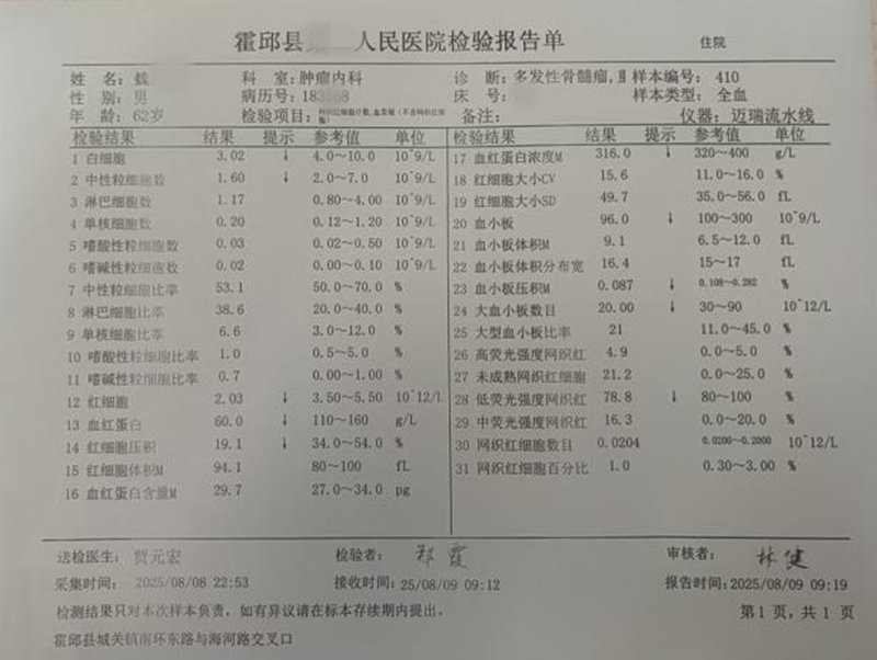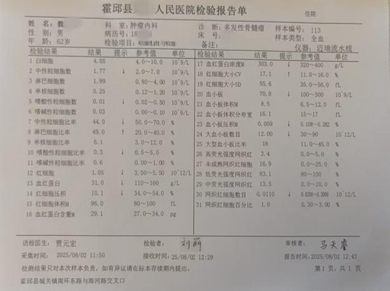 在医学的疆场上,每一次疑难病例的攻坚都是对医者智慧与担当的严峻考验。近日,霍邱县人民医院(南区)肿瘤内科与输血科携手作战,成功为一名多发性骨髓瘤患者破解 “正反定不符” 的诊疗困局,通过精准配血与科学输注,让濒临枯竭的生命之河重新奔涌,再次彰显了院区在复杂血液病诊疗领域的硬核实力。