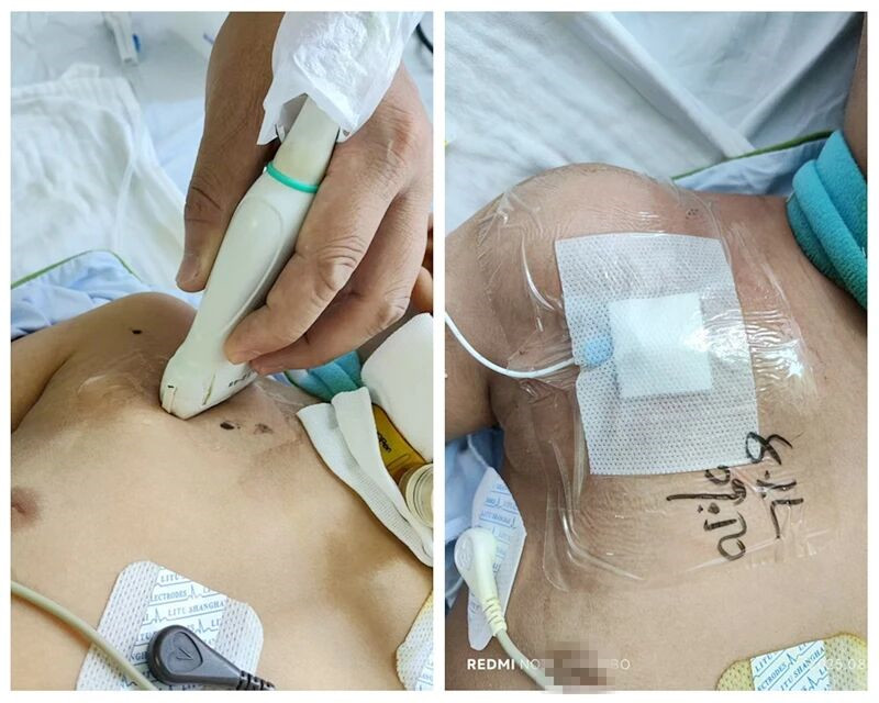 当日,一名病情危重的7岁男童被送入ICU救治。因患儿需要立即建立稳定的静脉通路用于输注抢救药物和营养支持,面对儿童血管纤细、解剖结构特殊的挑战,重症医学科团队决定采用超声引导下腋静脉置管术。医疗团队凭借精湛技术,在超声设备的实时引导下,精准完成穿刺置管操作,展现了高超的专业水准和团队配合能力。