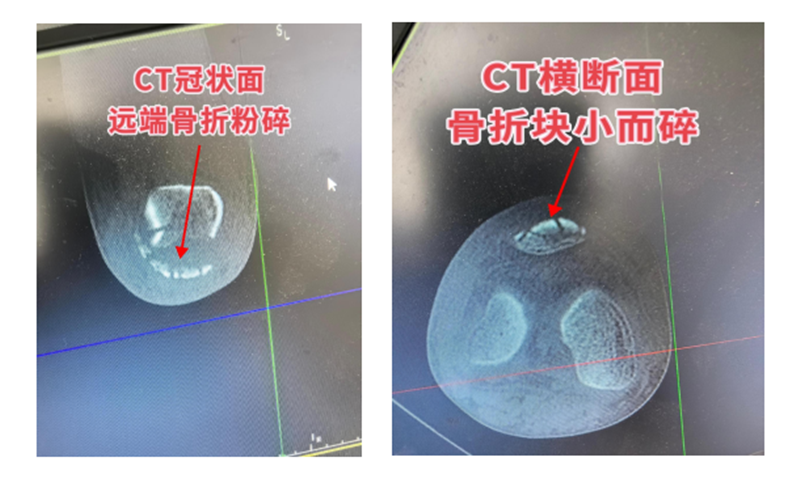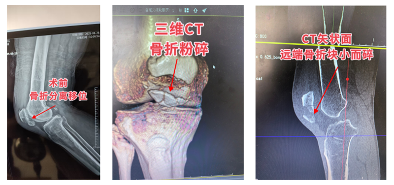 患者余先生因摔伤导致右膝肿痛、活动受限4小时入院,经膝关节X线片和三维重建CT检查,诊断为“右髌骨远端粉碎性骨折”。考虑到患者高龄伴有骨质疏松,骨折粉碎严重且骨折块小,传统的克氏针钢丝张力带或髌骨爪固定方式难以实现有效固定。面对这一挑战,骨一科团队在王福军主任医师主持下进行了详细的术前讨论,最终决定采用目前国内先进的经骨道缝线固定术。这种术式通过特殊缝线贯穿骨道对骨折进行复位固定,不需要任何金属内固定物植入,特别适合该患者。