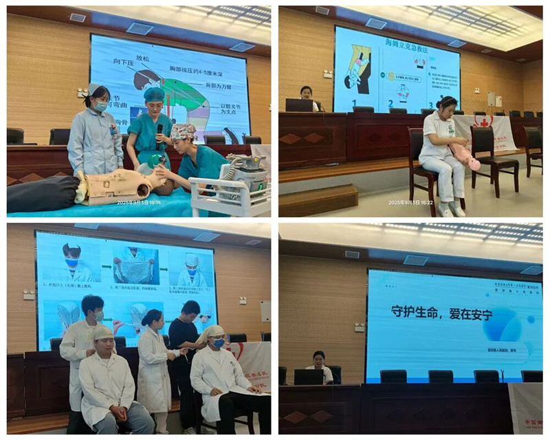 本次活动采用“理论讲解+实操演示”相结合的方式,聚焦常见急救场景展开系统培训。手术室护士通过图文并茂的PPT详细讲解心肺复苏(CPR)操作流程,并进行现场演示,从意识判断、紧急呼救,到胸外按压的深度与频率、开放气道及人工呼吸的正确姿势,逐一进行规范展示。耳鼻咽喉头颈外科护士针对儿童和老年人易发生的气道异物梗阻,借助人体模型演示海姆立克急救法,明确区分成人与婴幼儿的操作差异,特别强调腹部冲击的力度控制与替代方法。